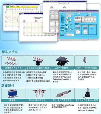 设备构成:测试机本体 、电脑、显示器、打印机 荷重元(50、20、5、2kg选一个) ;大型X-Y移动台 整排插拔用自动求心装置(多功能夹治具) ;单孔插曲拔自动求心装置(单支圆夹治具) 选择配件 :铣沟机(易变形连接器专用治具) 、单pin于塑胶保持力专用夹具 、架高治具(线材出线专用) 动态阻挠测试。