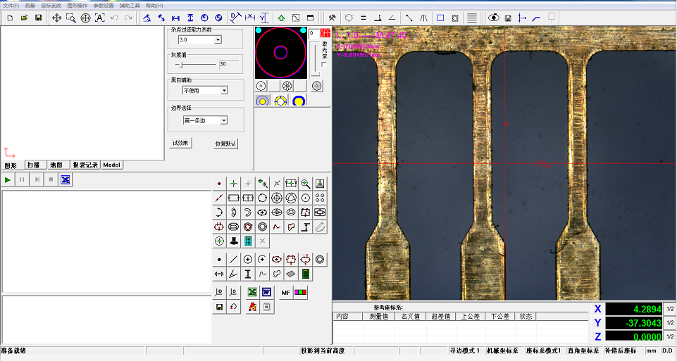 13、自动寻边功能,图像锐化,消除物体边缘毛刺影响,提高检测精度和重复性。圆环测量,角度测量,线宽,线距等测量。