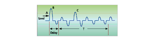 使用者可以设定一个电流准位来触发开始量测电流的时间点A,另外可设定另一个参数延迟(DELAY),用来延迟真正撷取电流波形的时间,可帮助忽略掉刚开始不需要的波峰B。还有另一参数TIME,为撷取波形的时间长度,这样66202数位功率表就会量测到C点的波峰电流。